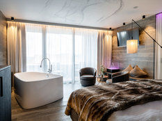 Ausgestattet mit einem Kuschelbett, einem Whisper-Airpool und einer Loggia bietet dieses Zimmer alles, um unvergessliche Glücksmomente zu sammeln. Dazu das warme und gemütliche Design mit geschmackvollen Details. Eine Wohlfühlatmosphäre mit atemberaubendem Ausblick. Was braucht man mehr?