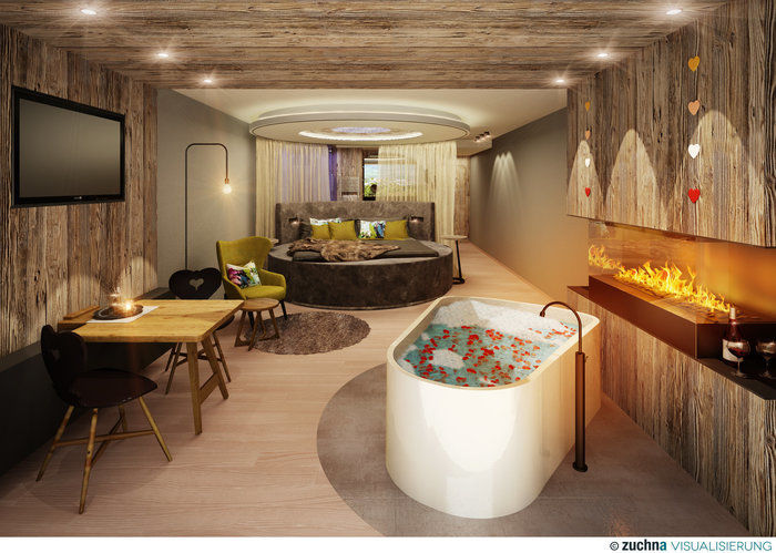 Die Romantiksuite "Nur wir Zwei" mit extragroßem runden Kuschelbett, Whisperairpool, Effektkamin, großer Regendusche, Mini Altholz-Stube lädt Sie zum Kuscheln und Träumen ein. Die Romantiksuite "Nur wir Zwei" Deluxe ist zusätzliche mit einer Panoramasauna ausgestattet.