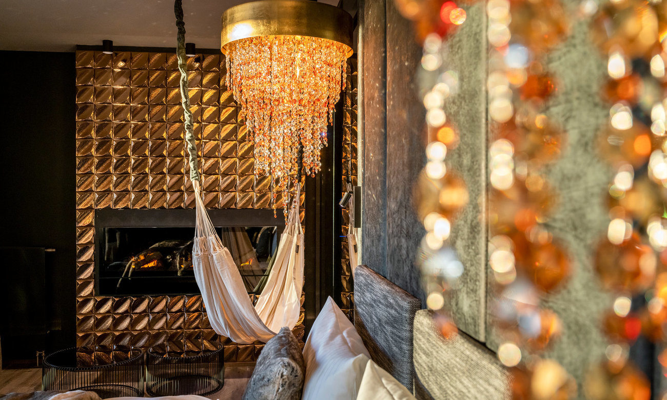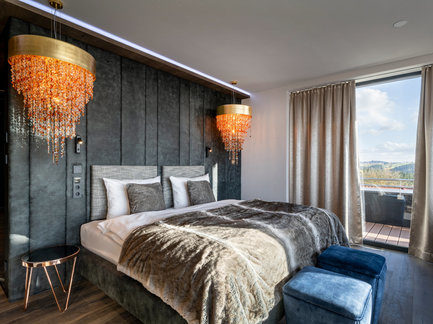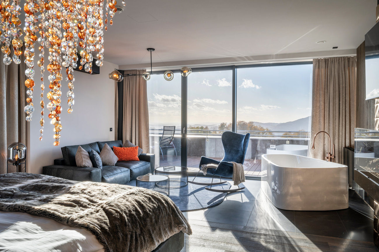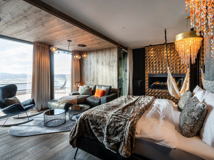 Ausgestattet mit einem Kuschelbett, einem Whisper-Airpool und einer Loggia bietet dieses Zimmer alles, um unvergessliche Glücksmomente zu sammeln. Dazu das warme und gemütliche Design mit geschmackvollen Details. Eine Wohlfühlatmosphäre mit atemberaubendem Ausblick. Was braucht man mehr?