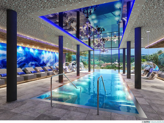 Unser Indoor-Pool und Infinity Außen-Pool mit wunderbarem Panoramablick!
