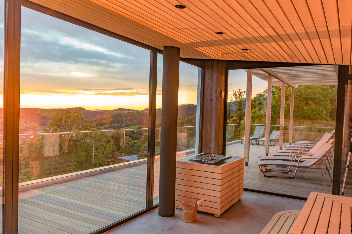 In unserer Panoramasauna werden Sie mit einen Blick auf den Bayerischen Wald und unsere Hausberge verwöhnt. Schwitzen Sie bei angenehmen 70°C.