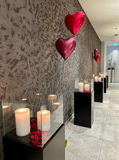 Der ganze Hüttenhof stand im Zeichen der Liebe. Es lag Liebe in der Luft.. Ballons in Herzform waren im gesamten Hotel zu finden, Rosenblütenblätter und Kerzenschein sorgten für eine romantische Umgebung. Sogar in unserem Wellnessbereich gab es in der Sauna eine besondere Art des Aufgusses, um das Saunaerlebnis zu intensivieren und eine einzigartige Atmosphäre zu schaffen. Im Restaurant waren für diesen besonderen Tag alle Tische romantisch eingedeckt und die Speißen mit herzförmigen Elementen und frischen Blumen garniert.