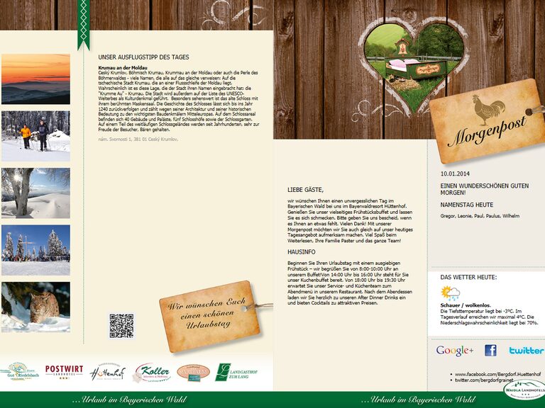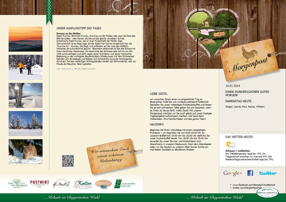 Seit einigen Tagen erhalten unsere Gäste eine neue Morgenpost - Neben Ausflugstipp und Spruch des Tages, dürfen natürlich das Menü, eine Getränkeempfehlung und Veranstaltungen nicht fehlen!